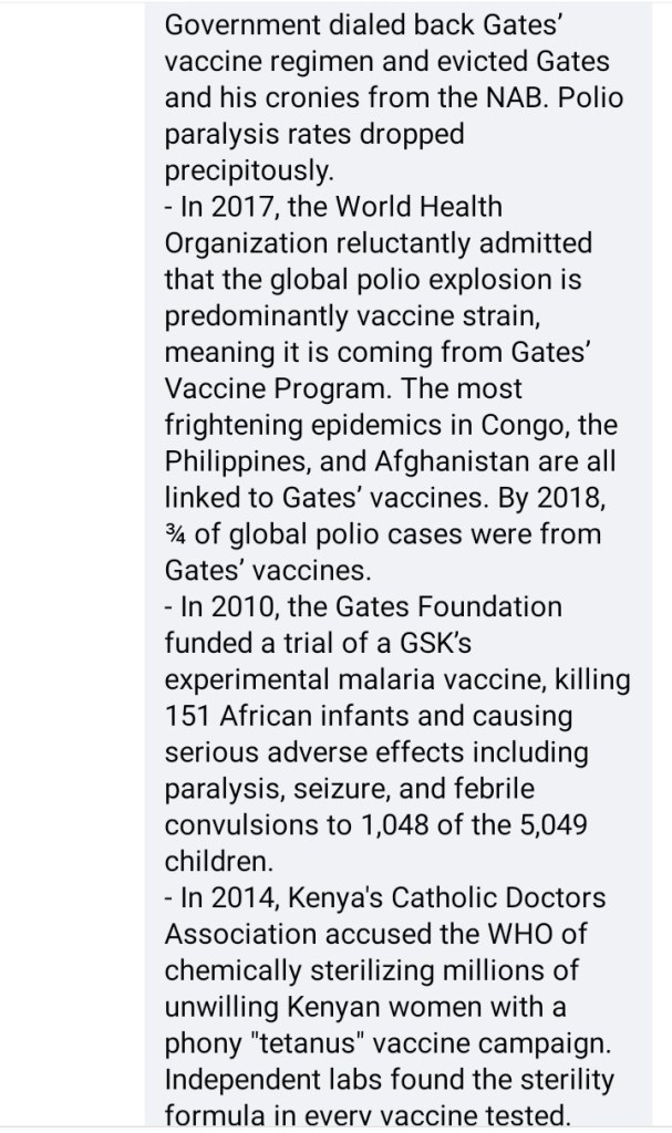 Promising to eradicate Polio with $1.2 billion, Gates took control of India ‘s National Advisory Board (NAB) and mandated 50 polio vaccines (up from 5) to every child before age 5. Indian doctors blame the Gates campaign for a devastating vaccine-strain polio epidemic that paralyzed 496,000 children between 2000 and 2017. In 2017, the Indian Government dialed back Gates’ vaccine regimen and evicted Gates and his cronies from the NAB. Polio paralysis rates dropped precipitously. In 2017, the World Health Organization reluctantly admitted that the global polio explosion is predominantly vaccine strain, meaning it is coming from Gates’ Vaccine Program. The most frightening epidemics in Congo, the Philippines, and Afghanistan are all linked to Gates’ vaccines. By 2018, ¾ of global polio cases were from Gates’ vaccines.