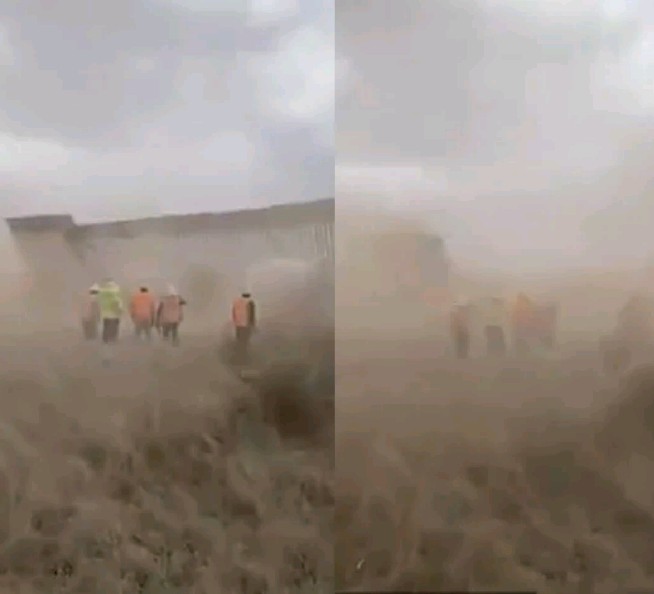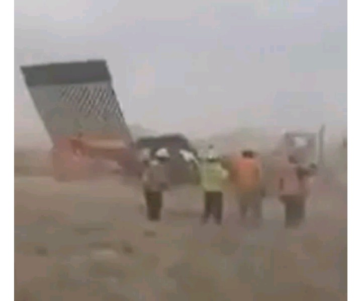 The video posted to Twitter by journalist Yadith Valdez on Sunday, July 26, shows construction workers standing by and watching helplessly as fierce gusts knock down the steel structure separating the US and Mexico.