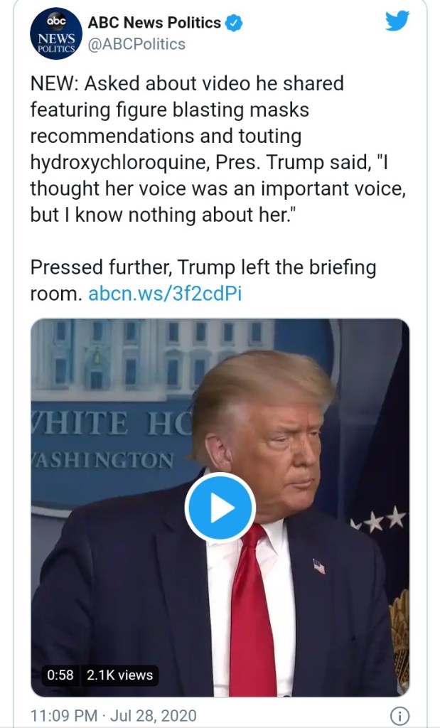 In the video that Trump retweeted, his son directly shared and which Twitter later removed for violating its “misinformation policy,” a group of what appeared to be doctors downplayed the effectiveness of masks and lockdowns and praised the efficacy of hydroxychloroquine.