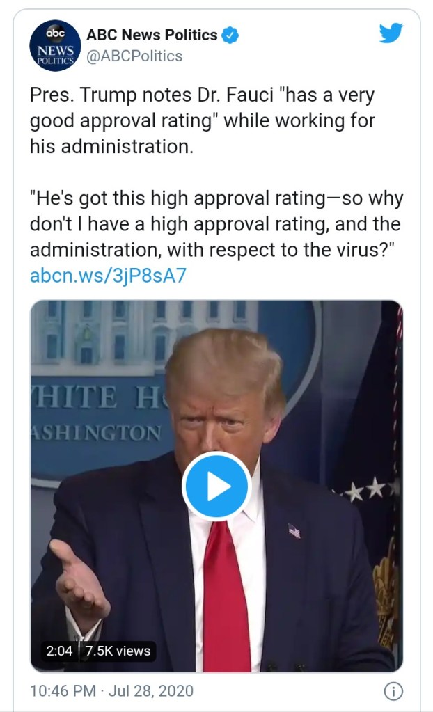 “The overwhelming, prevailing clinical trials that have looked at the efficacy of hydroxychloroquine have indicated that it is not effective in coronavirus disease,” Fauci told ABC News Chief Anchor George Stephanopoulos on “Good Morning America,” just hours after the president’s retweet Monday night.