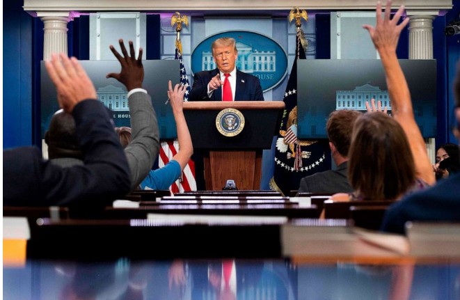 President Donald Trump speaks to the press in the Brady Briefing Room of the White House in Washington,on July 28, 2020.