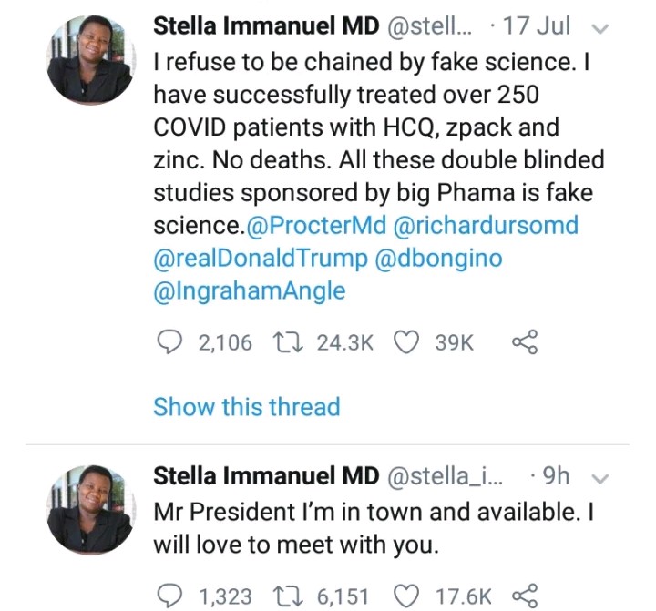 Dr Stella Immanuel spoke out during a press conference at Washington. She stated that the antimalarial drug, hydroxychloroquine, zinc, and antibacterial drug, Zithromax were effective in the treatment of Coronavirus. She went on to accuse her colleagues, public figures, and pharmaceutical companies of cover-up.