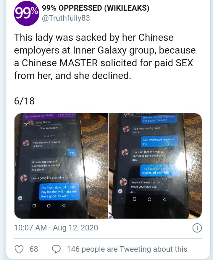 This lady was sacked by her Chinese employers at Inner Galaxy group, because a Chinese MASTER solicited for paid SEX from her, and she declined.