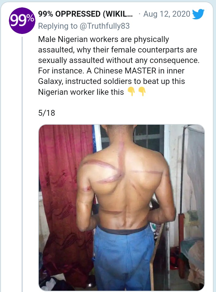 For instance. A Chinese MASTER in inner Galaxy, instructed soldiers to beat up this Nigerian worker like this.