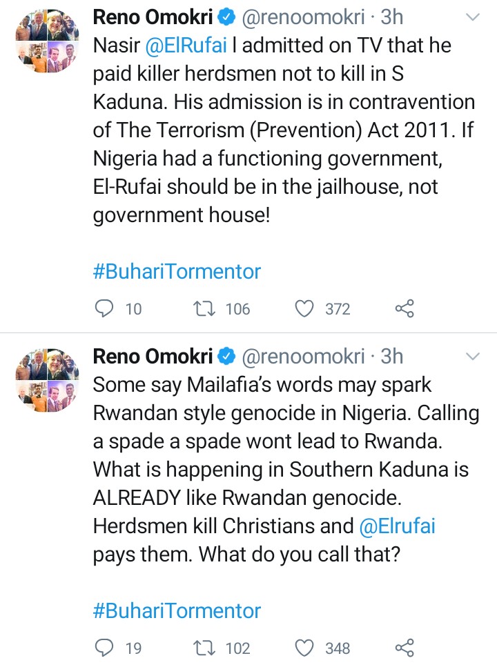 Herdsmen kill Christians and @Elrufai pays them. What do you call that? he wrote