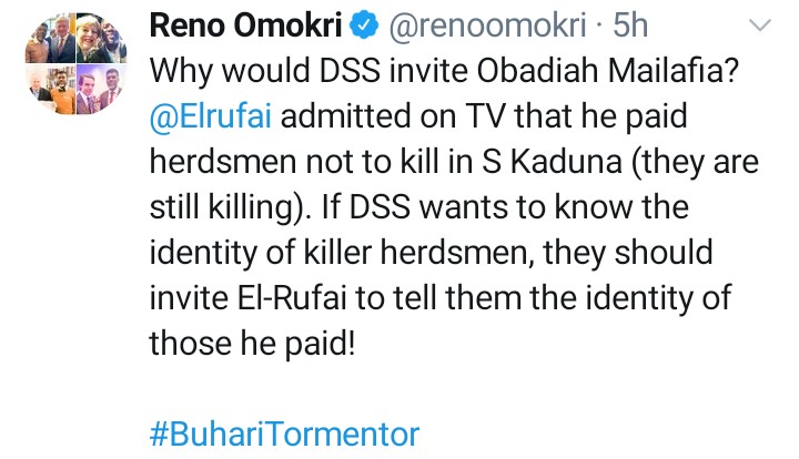 In tweets he shared, Reno Omokri stated that the DSS should be inviting Governor Nasir El-Rufai of Kaduna state.