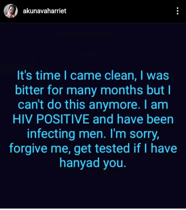 “It’s time I come clean. I was bitter for many months but I can’t do this anymore. I am HIV positive and I have been infecting men. I am sorry, forgive me. Get tested if I have hanyad you.”