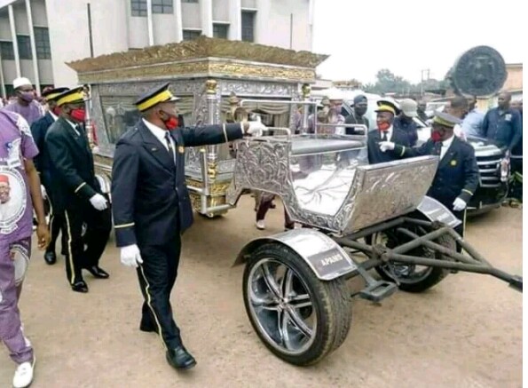 Photos from the funeral of the Onowu Neni show that he was buried in an elaborate glass casket that cost millions of Naira. Unverified reports claim it cost 34 million Naira.