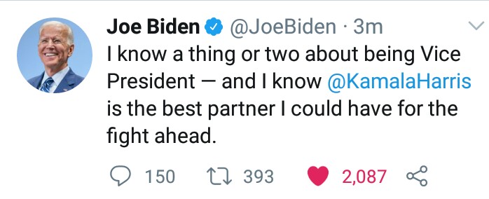 In Biden’s recent tweet, the former vice president and the presidential candidate for the democrats in the forthcoming US election has stated clearly that Kamala Harris is the best partner he could have for the battle ahead.