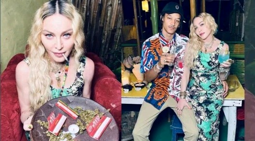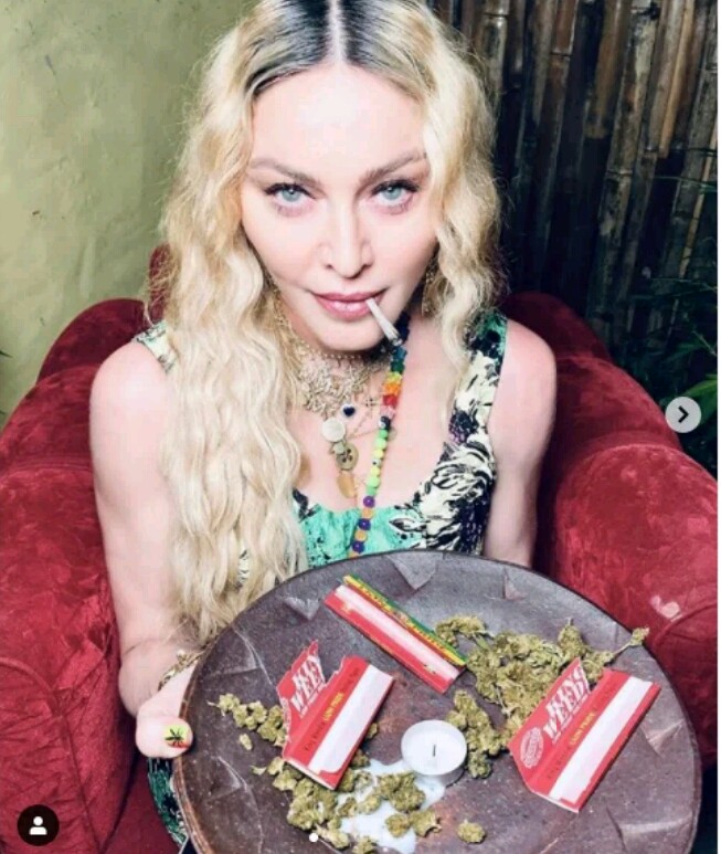 In one photo, Madonna who wore a stunning teal floral gown was pictured with a tray of marijuana and joint hanging from lips.