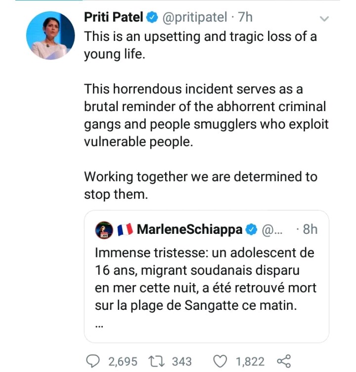 Home Secretary Priti Patel, who has pledged to make the route “unviable”, said the death is “an upsetting and tragic loss of a young life”.