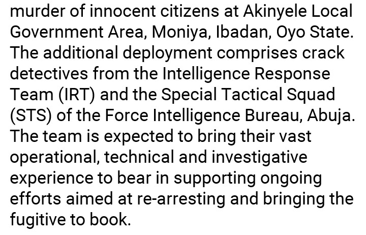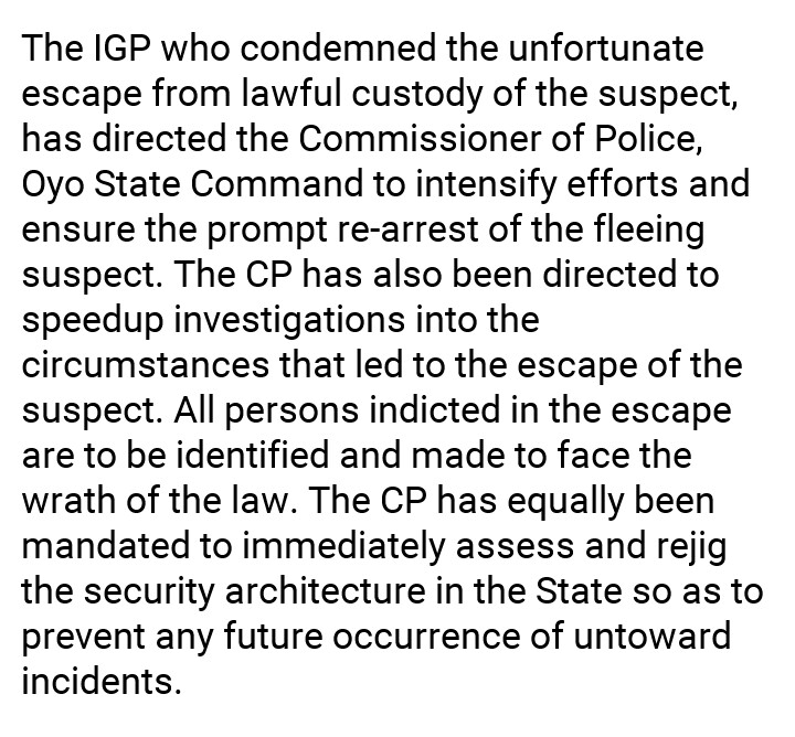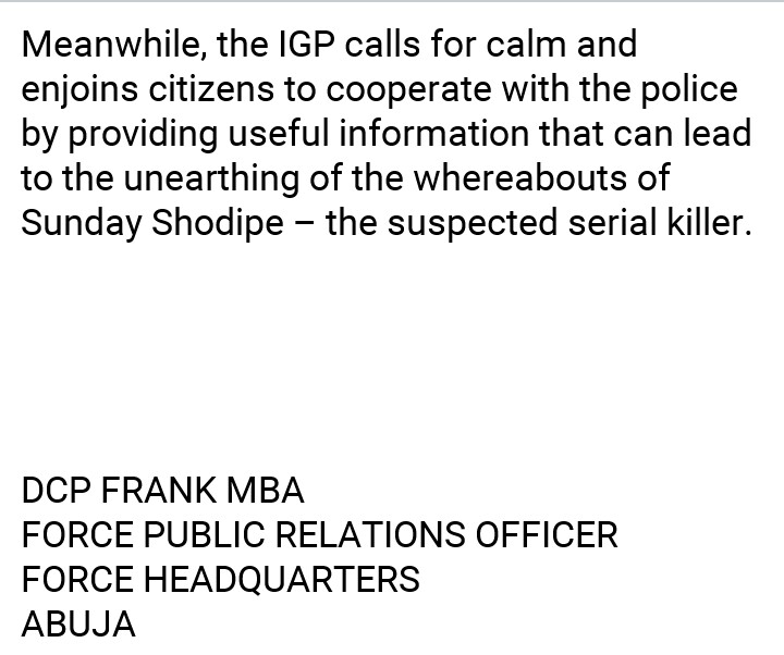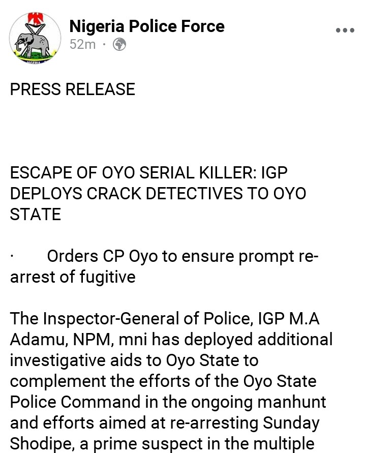 19 Aug 2020 K. Paul Inspector General of Police Deploys Additional Investigative Aids To Oyo State Over Escapee Suspected Serial Killer, Sunday Shodipe Share this: Click to share on X (Opens in new window) X Click to share on Facebook (Opens in new window) Facebook Click to share on WhatsApp (Opens in new window) WhatsApp More Click to share on LinkedIn (Opens in new window) LinkedIn Click to share on Pinterest (Opens in new window) Pinterest Like Loading... Related