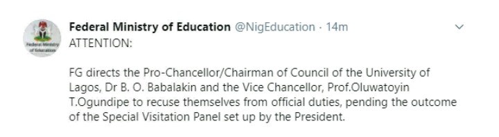 The Federal government has waded in on the crisis rocking the University of Lagos and has directed the Pro-Chancellor and Chairman of Council of the University of Lagos, Wale Babalakin, and Vice-Chancellor, Prof. Oluwatoyin Ogundipe, to step aside from their official duties.
