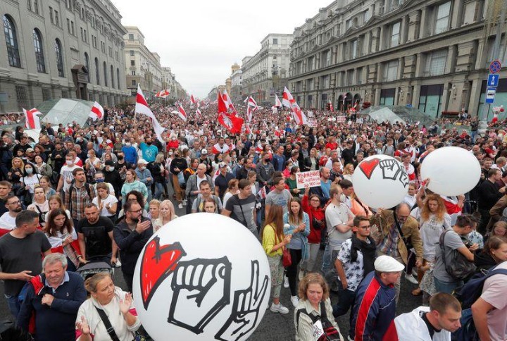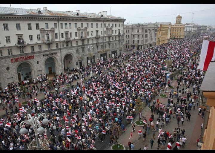The streets of Minsk turned red and white as a flood of demonstrators carried flags symbolising their opposition to Lukashenko and chanted for him to leave power and for new elections to be held.