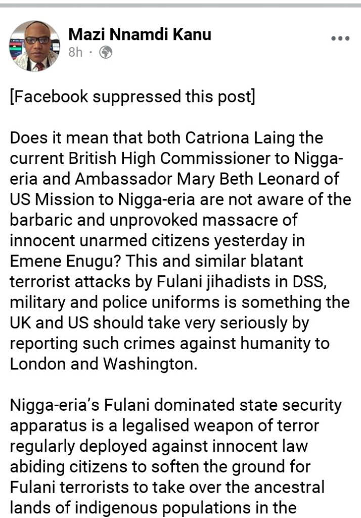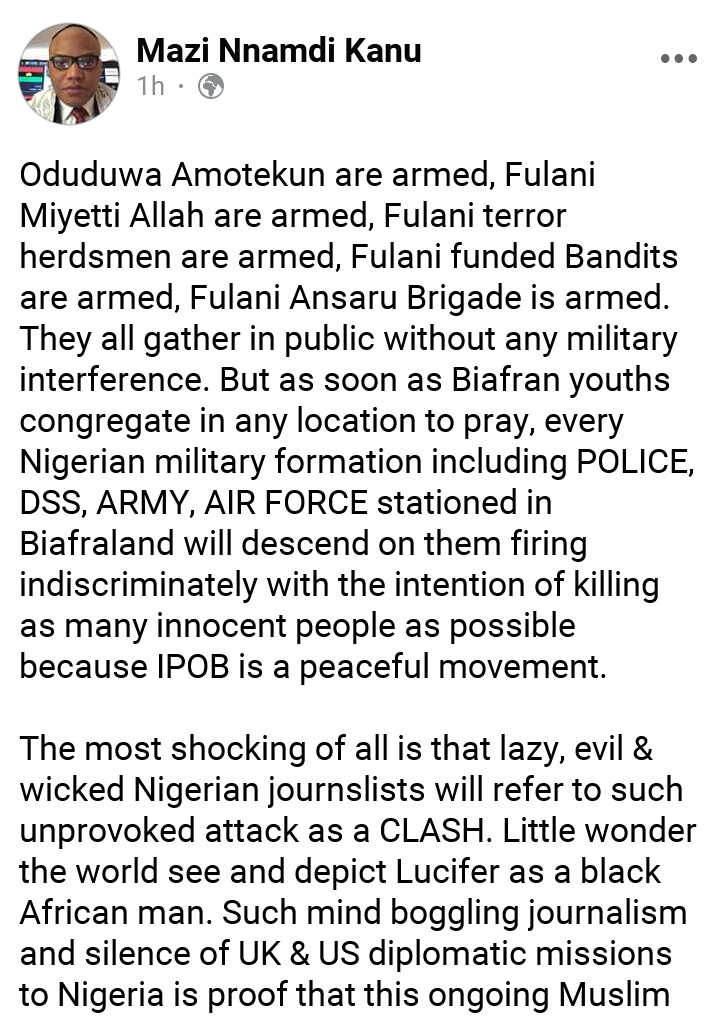 Mazi Nnamdi Kanu, IPOB leader via his social media handle has condemned the killings of some of IPOB members in Emene, Enugu yesterday.