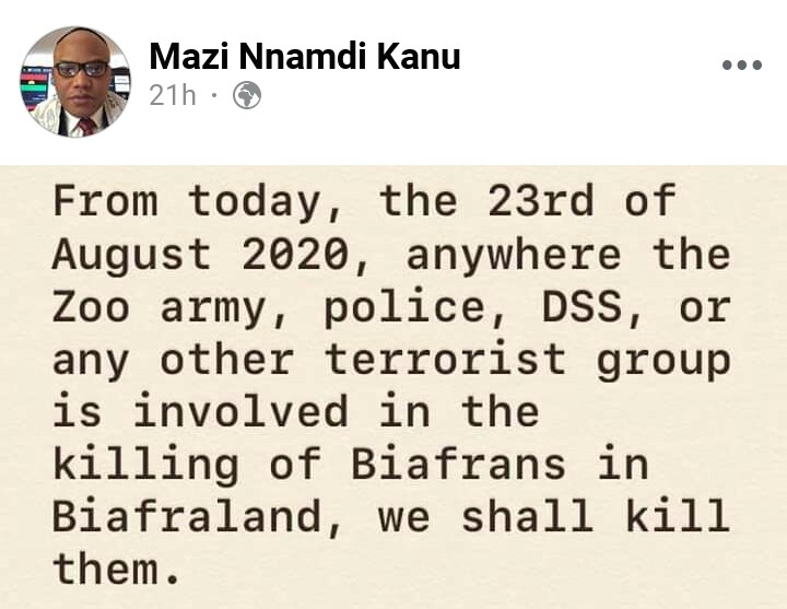 Since the killings of some of his followers in Enugu, Kanu, in series of posts has threatened to retaliate.