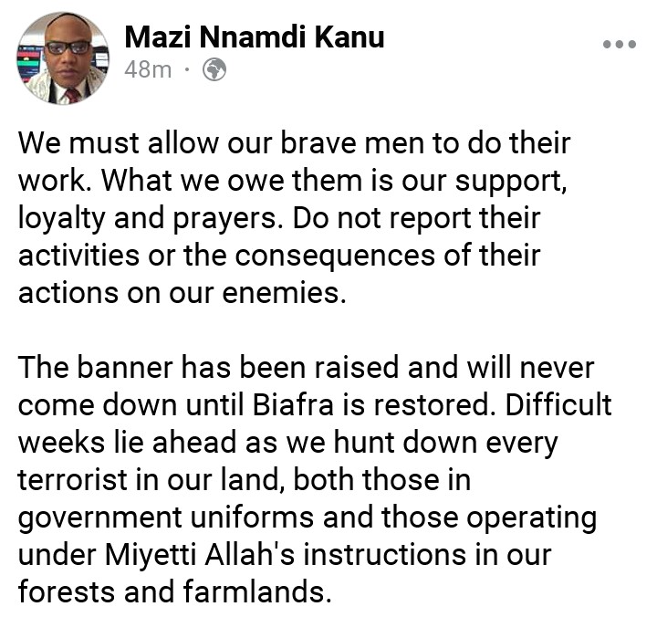 In his recent post; Kanu urges his followers not to report the activities of IPOB soldiers again.