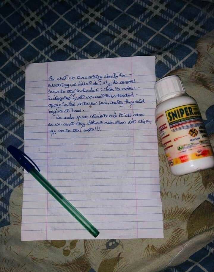A bottle of sniper, a pen and written note seen in the pictures predicts probable suicide.