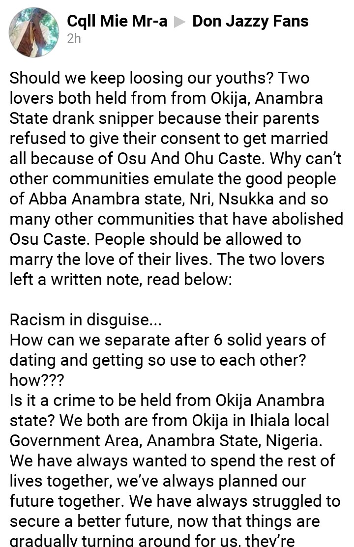 Young lovers from Anambra state allegedly committed suicide to protest against alleged racism-like of traditional hereditary.