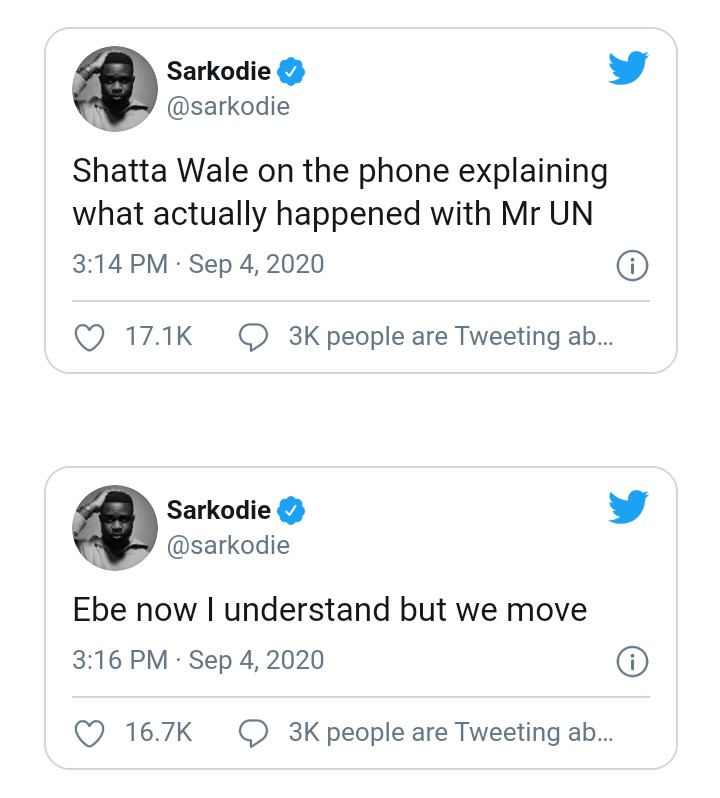 Ghanaian rap icon, Sarkodie has revealed in a new tweet that his buddy Shatta Wale has called him over the phone to explain things to him relative to the trending fake UN awards brouhaha.