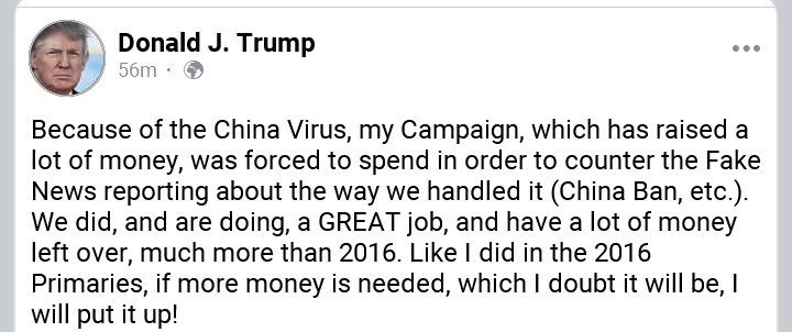 The president also said, via his facebook page that the China virus forced him to spend in order to counter the fake news reporting about the way he handled it.