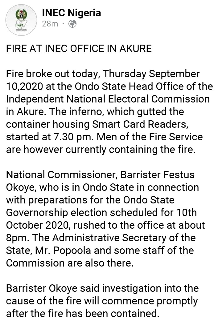 This was revealed via the official INEC office. The fire broke out around 7:30p.m tonight, 10th Sept.,2020.