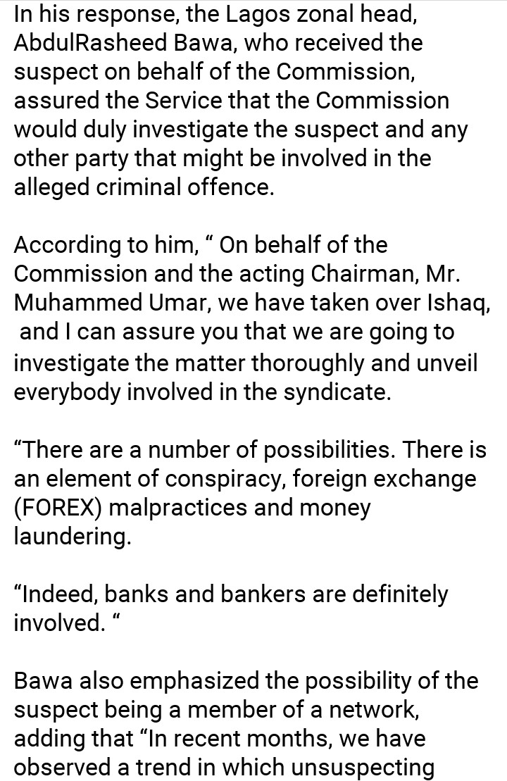 The suspect was said to have been arrested by the Nigerian Custom and handed over to the EFCC for investigation and prosecution.