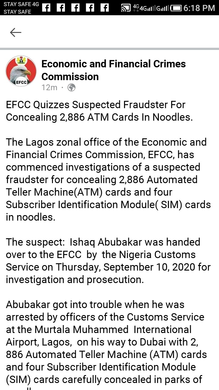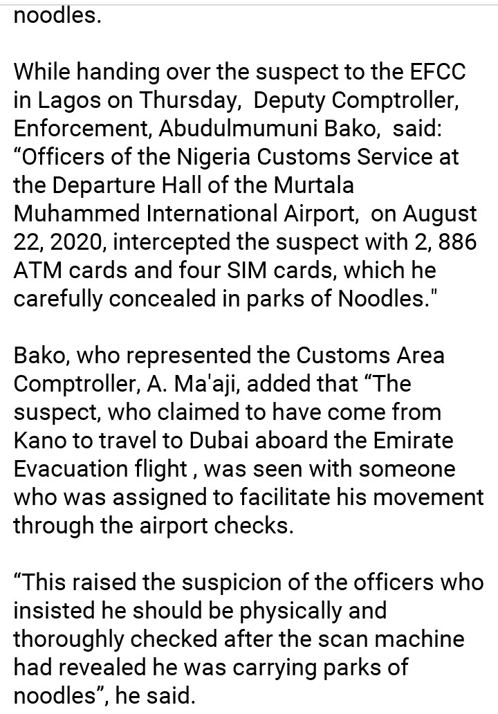 According to the report, the alleged fraudster, Ishaq Abubakar was accosted at the Murtala Mohammed International Airport, Lagos while on his way to Dubai with 2,886 ATM cards and four SIM packs concealed in packs of noodles.