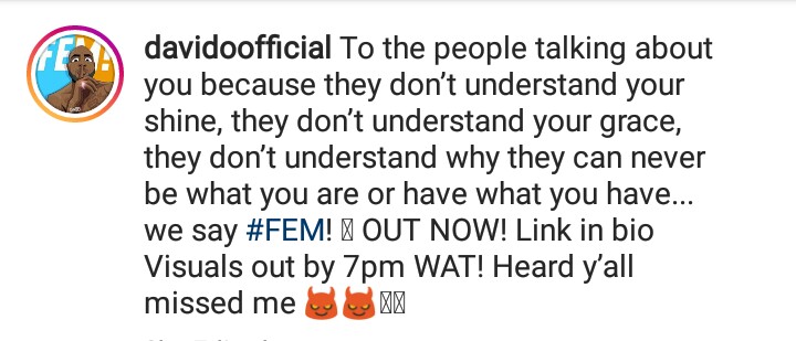 “To the people talking about you because they don’t understand your shine, they don’t understand your grace, they don’t understand why they can never be what you are or have what you have… we say #FEM! OUT NOW! Visuals out by 7pm WAT! Heard y’all missed me”
