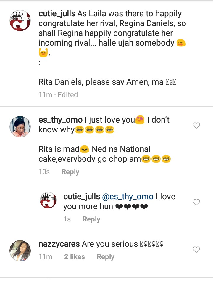 According to a recent post by @cutie_julls via Instagram; Ned Nwoko is about to marry his seventh wife and urged Regina Daniels to embrace it the way Laila embraced her when she was married.