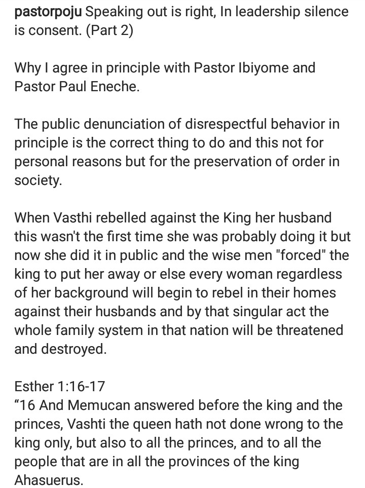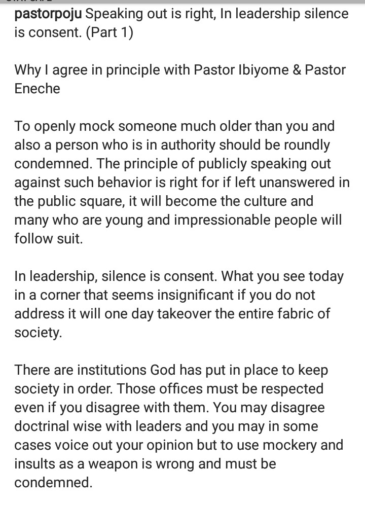 Pastor Poju, via his Instagram page revealed why he agreed in principle with Pastor Ibiyeomie and Pastor Enenche and titled it,’ Speaking Out Is Right. In leadership, silence is consent’.